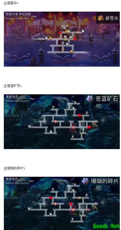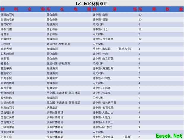 ↑↑上图为强化1-10所需全部材料和材料地址,需要注意的是沙蒂拉体育场怪物材料要从 次元夹缝的记忆之殿进去。