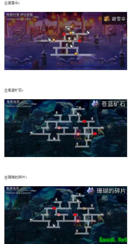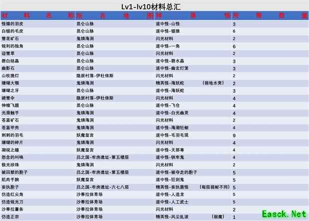 ↑↑上图为强化1-10所需全部材料和材料地址,需要注意沙蒂拉体育场怪物材料要从 次元夹缝的记忆之殿进去。