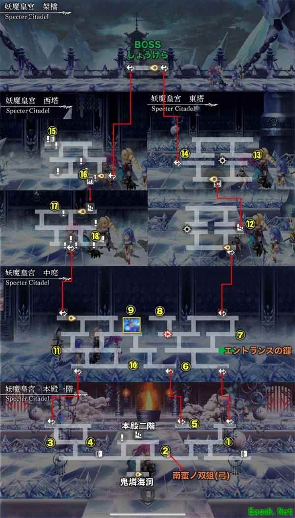 1、在地图正右方打开开关,从地图右下方的阶梯进入“本殿三楼”。