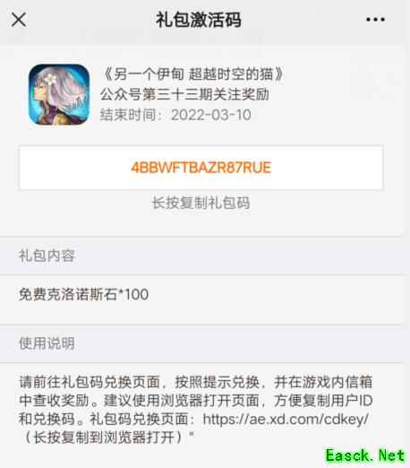 以上就是小编整理的关于《另一个伊甸:超越时空的猫》微信公众号33期礼包兑换码的全部内容,更多游戏攻略请持续关注手游网!