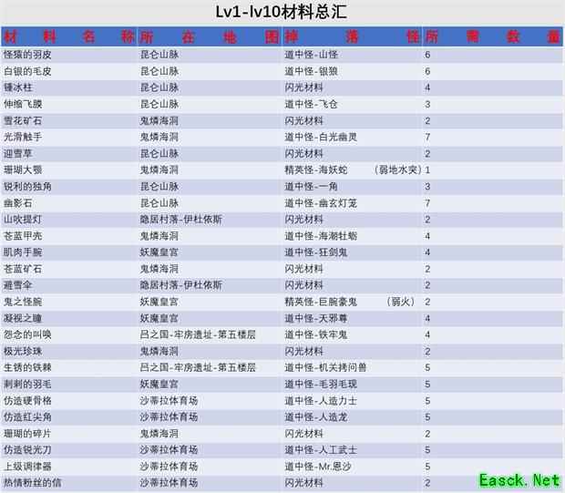 ↑↑上图为强化1-10所需全部材料和材料地址,需要注意的是昆仑山脉要从雪村里面进去,沙蒂拉体育场要从次元夹缝的记忆之殿进去。
