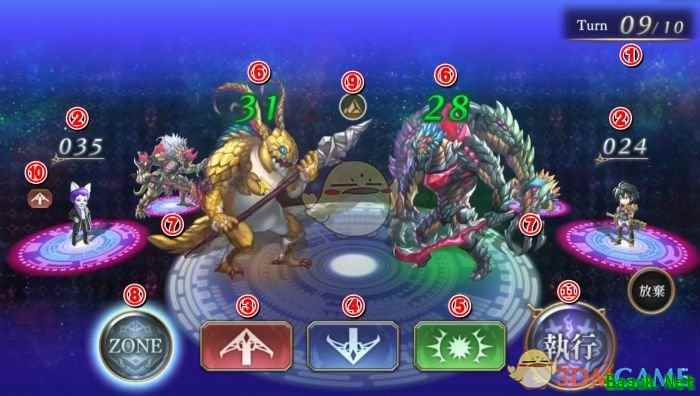 ⑧ZONE技能:选择展开属性ZONE,展开后持续3个结算周期,可以被新展开的ZONE覆盖,每场战斗每个ZONE可使用一次,ZONE和技能可以在同一回合一起使用。