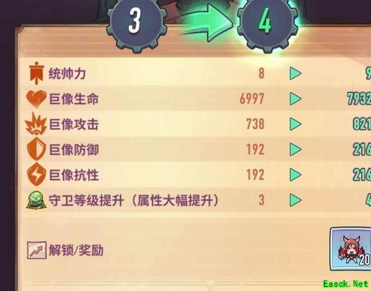 研究巨像升级,可以提升巨像的统帅力、生命值、攻击、防御、抗性、以及守卫最大等级。提升巨像等级还能解锁一些新兵种。