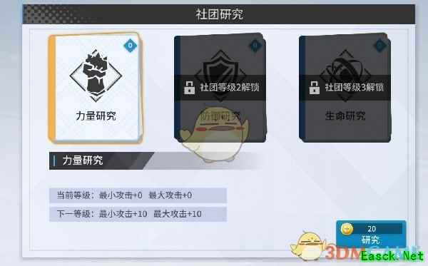 3、社团里面的研究由三个部分组成,分别是力量研究、防御研究和生命研究,其中力量研究是不需要附加条件就可以升级,防御研究需要社团等级达到2级才可以解锁,生命研究需要社团等级达到三级。