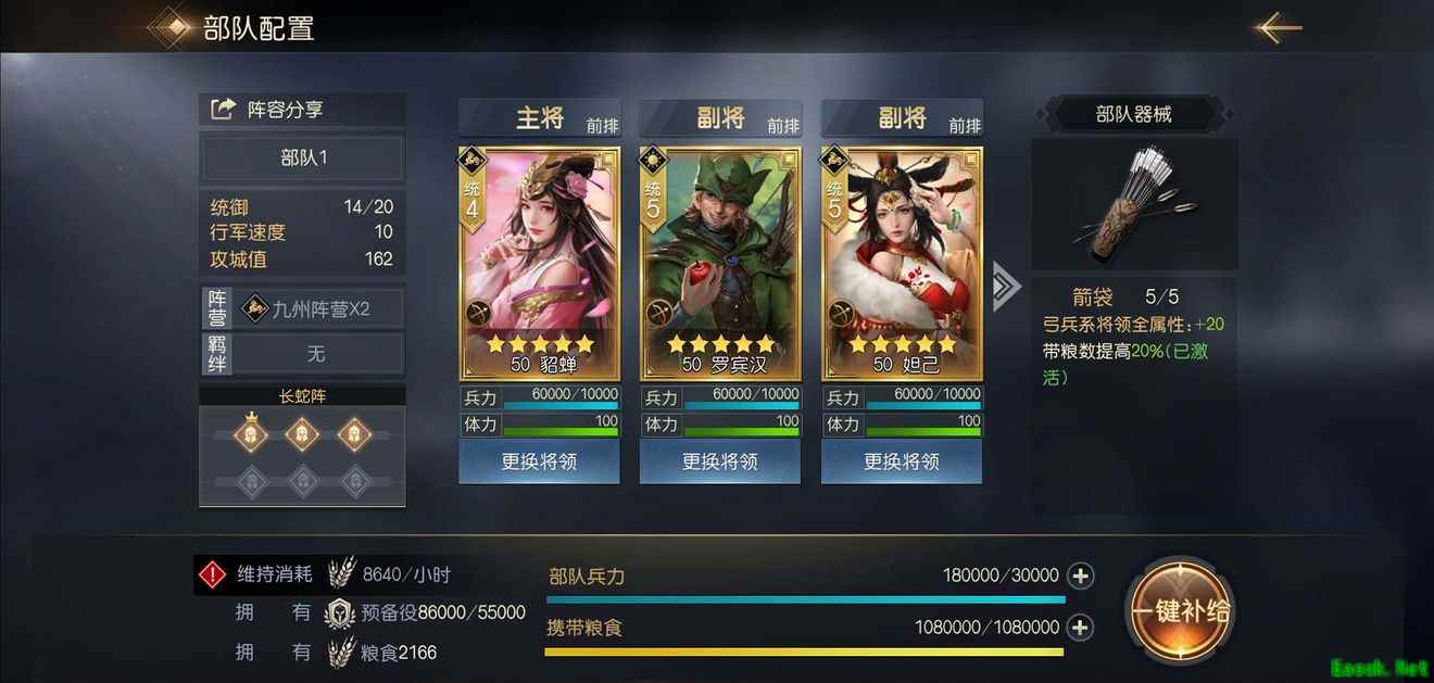 【貂蝉+罗宾汉+妲己】,这三个将领都为弓兵,所以在【劫富济贫】的增益下,都有高额的谋略属性加成,再搭配上貂蝉的控制型技能【闭月】,技能效果为:准备1回合,对敌方单体(优先智力最低)发动1次伤害率170%,满级350%的谋略攻击,并使其陷入【混乱】状态(攻击和技能无差别选择目标),持续2回合,附加效果:若目标将领为吕布时,使其陷入【蛊惑】状态(普通攻击和技能攻击必定选择己方目标),持续2回合;以及妲己的AOE技能【红颜祸水】,技能效果为:对敌方群体2人发动1次伤害率99%,满级180%的谋略攻击(受双方谋略之差影响,每10点谋略属性额外提升1.5%),使得阵容在伤害,控制等方面表现都十分优异。