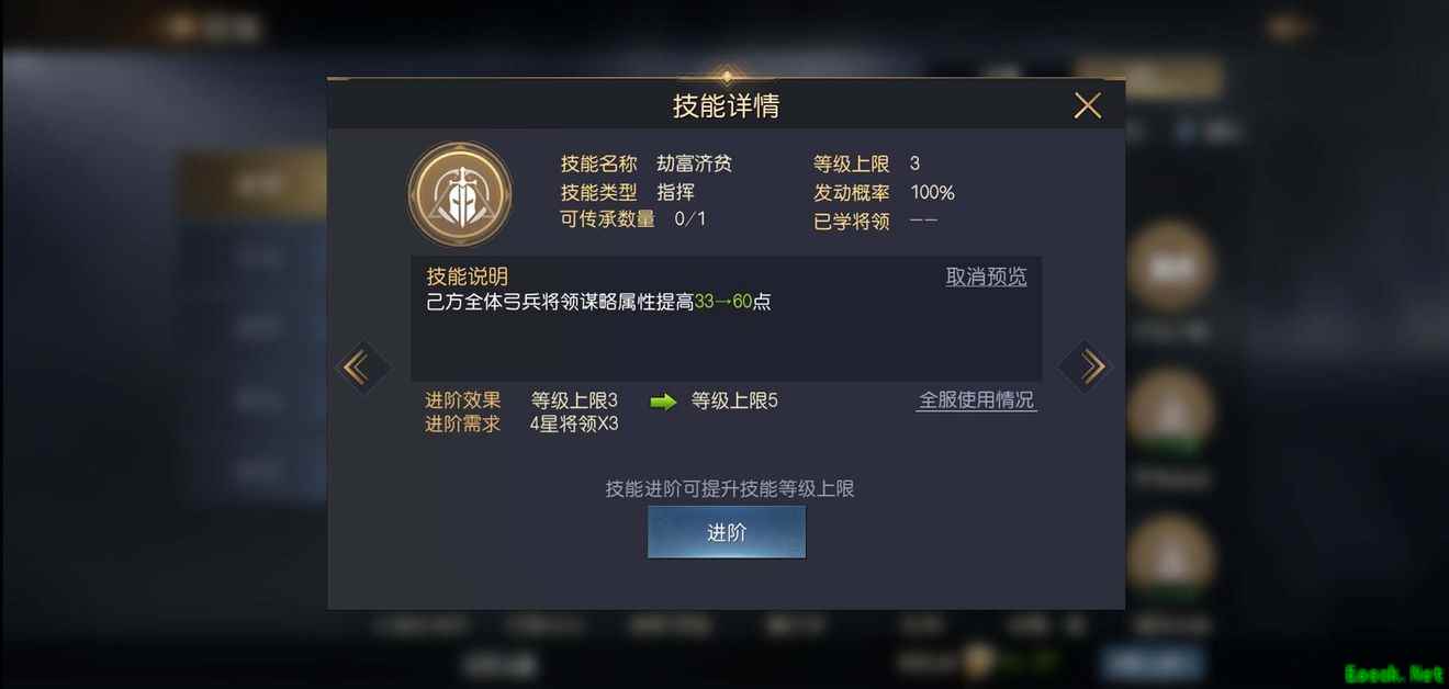 罗宾汉的自带技能【劫富济贫】,技能效果为:提升己方全体弓兵将领谋略属性33点,满级提高60点。这是一个全体增幅技能,高达60点的谋略属性加成,非常适合一些打谋略数值差的弓兵将领。