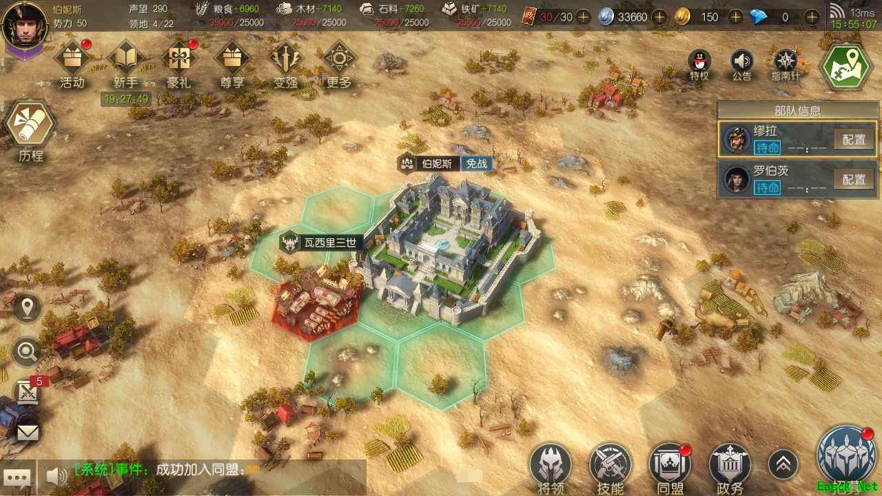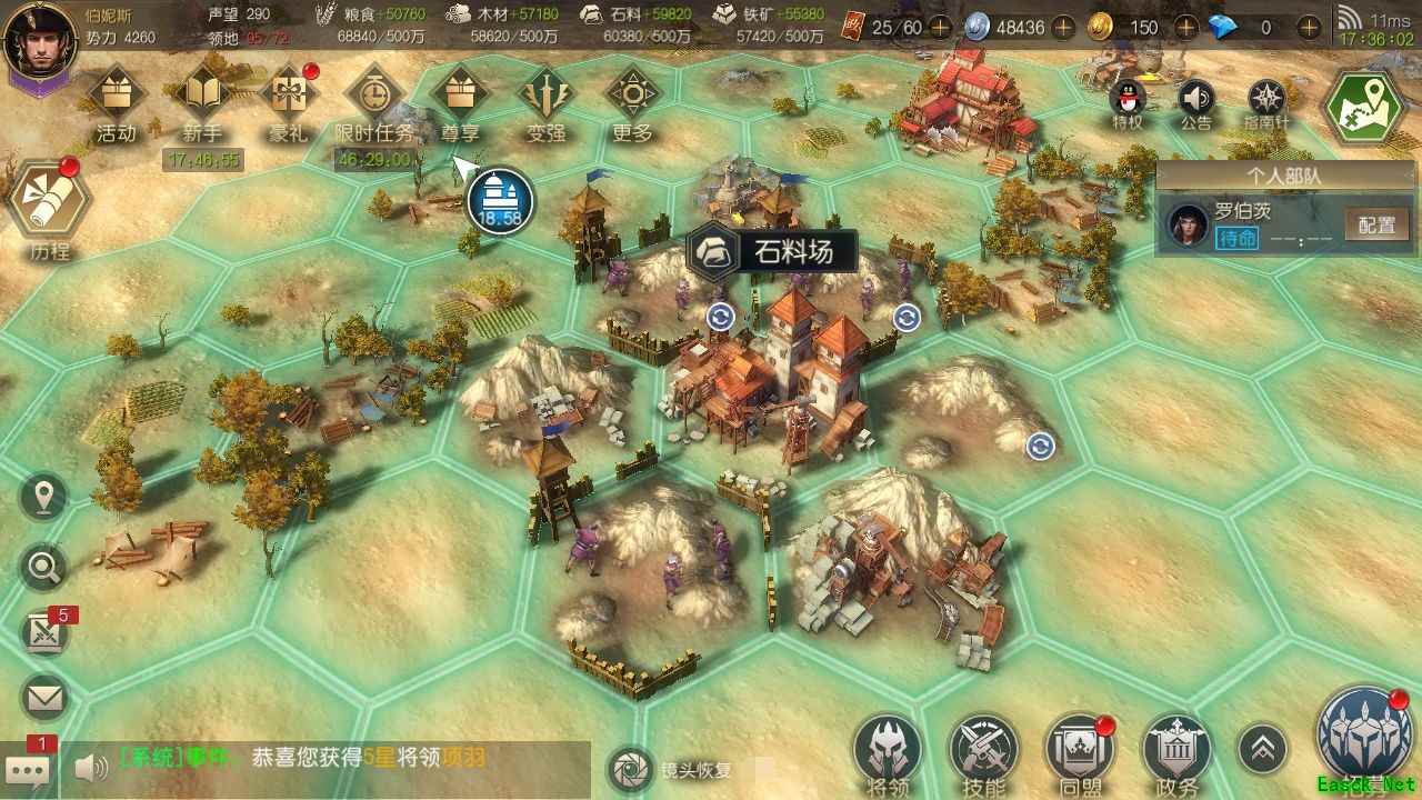占地是提升势力值和提升资源产量的最直接方式,所以第一步就是要攻占土地。建议一直保持能攻占的最高土地等级,例如当部队能开3级地时,就尽可能开3级地,并且把之前所占领的1、2级地放弃,替换成3级地,这样能够尽可能快速地提升势力值和资源的产量。而且,建议在选择土地种类的时候尽量多选石料,因为前期对于石料的需求特别大。