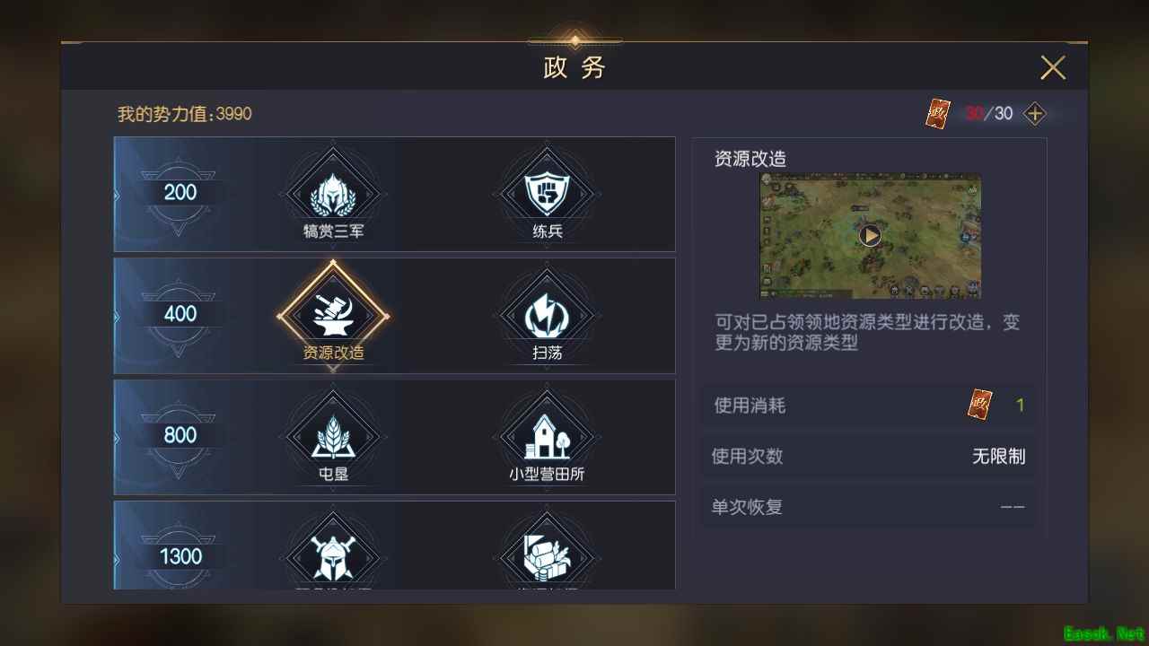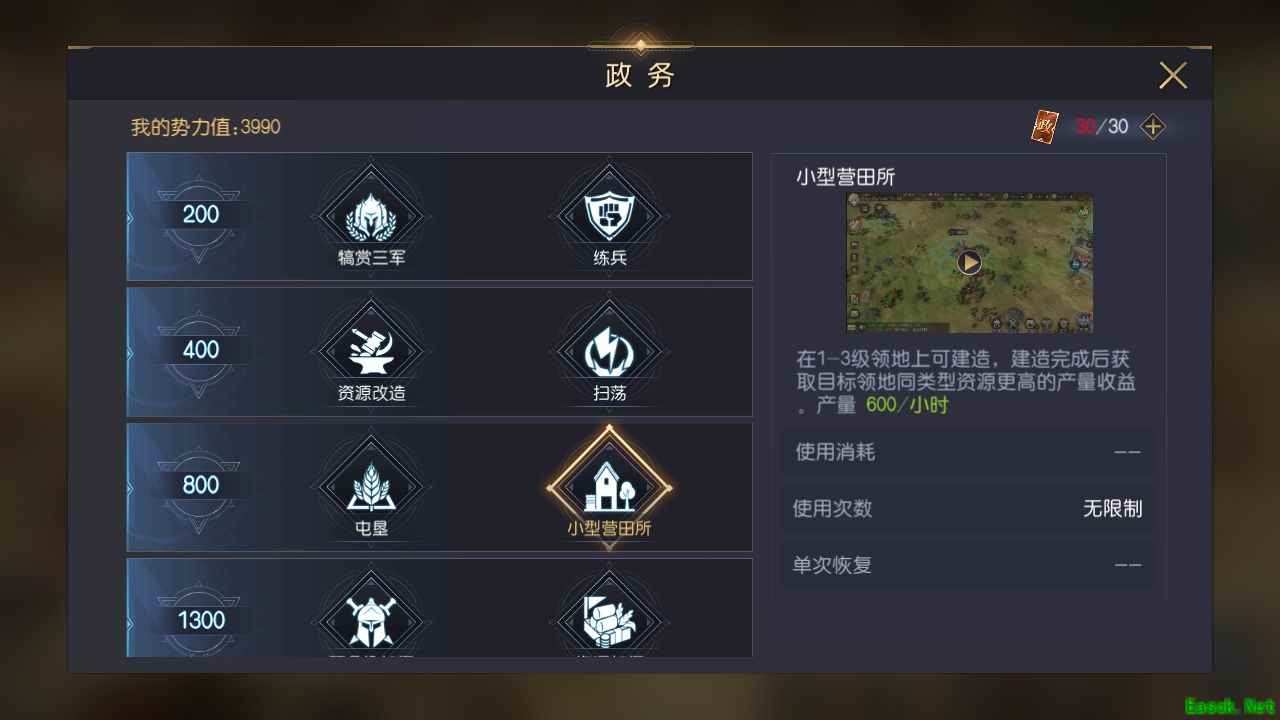 解锁条件:势力值800即可在政务功能中解锁。