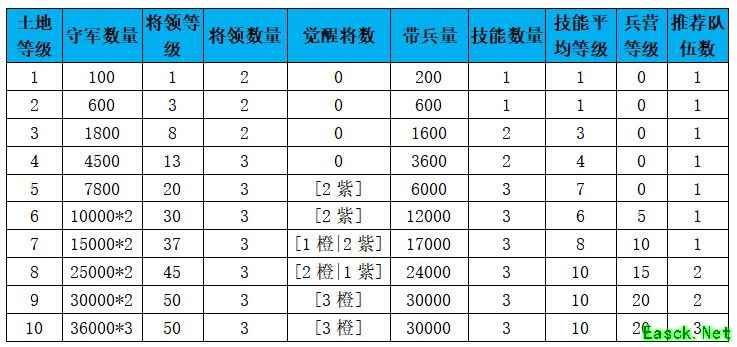 土地攻占秘典如下(独家一手资料),特别注意的是6级地开始有2队守军,10级地更是有3队守军,各位君主挑战的时候切记要准备充足。
