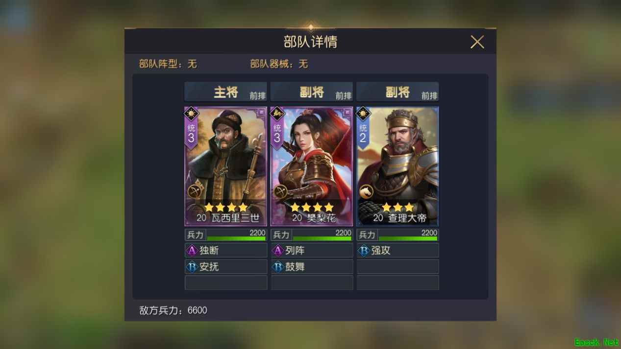 最后,想要快速开五,前提还是要多刷4,另外,在新地块数量不足或者距离主城较远的时候,可以选择在靠近主城的地块上进行练兵,如果前期部队统御不足以上三个五星将领,可以分其中一个五星去二队练级。