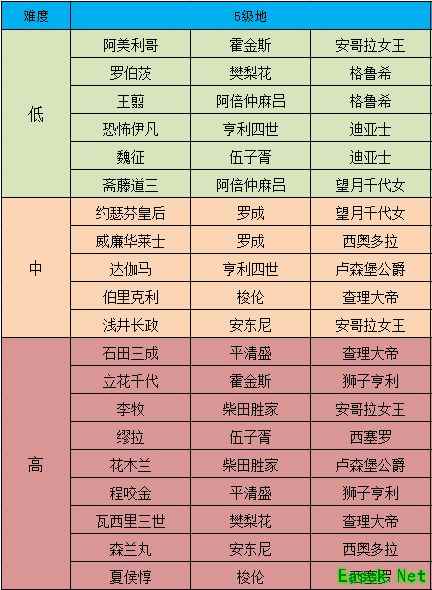 在打五级地之前,同样我们需要先侦察,细心的小伙伴可能发现了,1-5级土地同队内的守军将领兵种并不完全一样,那么我们怎么才能更好地打克制呢,在这我告诉大家,那就是优先选择克制守军主将的兵种,一来守军主将属性最高,克制他带来的收益最大,二来克制他有可能带来‘斩首’的效果,虽然获得的经验较少,但是在我们等级和兵力不是碾压守军的情况下,也能减小兵损,快速增加高级地块数量。另外同样要关注不同五级地之间难度上的差异,比如,瓦西里三世+樊梨花+查理大帝的组合,就同时拥有【缴械】控制效果,同时还有减伤效果,建议在刚开五级地的时候小伙伴们可以相对避开他,避免大兵损甚至翻车,而像恐怖伊凡队,就只是单纯的输出队,不具有控制,属于较为容易的五级地。具体可以参考以上“五级地难度表”。