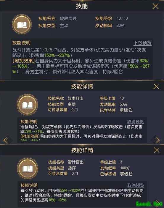 【智计百出】可在每次发动主动技能时,使下1次所造成的谋略伤害提高16%,满级提高25%,而【破敌纲领】和【战术打击】均是谋略攻击型的主动技能,且发动概率较高,这样便可进一步提高两个技能的谋略输出。