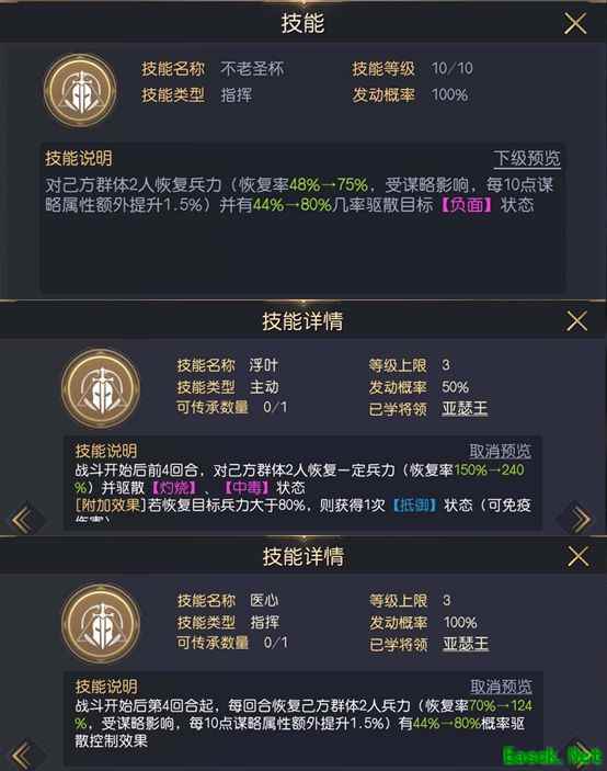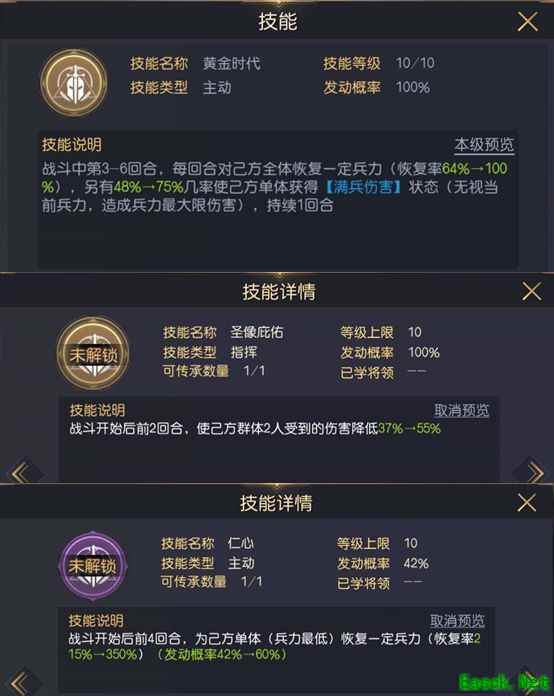 【仁心】则是在战斗开始后前4回合,为己方单体(兵力最低)恢复一定兵力(初始恢复率215,满级350%),该技能比较容易获得,主要作用是结合自带技能【黄金时代】,进一步提升战斗前期的回血能力,保证主将的兵力优势。