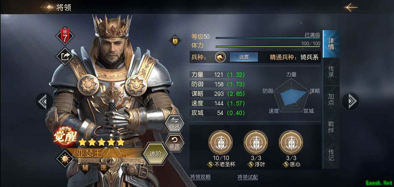 亚瑟王的自带技能为【不老圣杯】,能够为己方群体2人恢复兵力(初始48%,满级75%,每10点谋略属性额外提升1.5%),并有一定几率(初始44%,满级80%)驱散目标的【负面】状态。可见,此技能主要为部队提供治疗和解除负面效果。