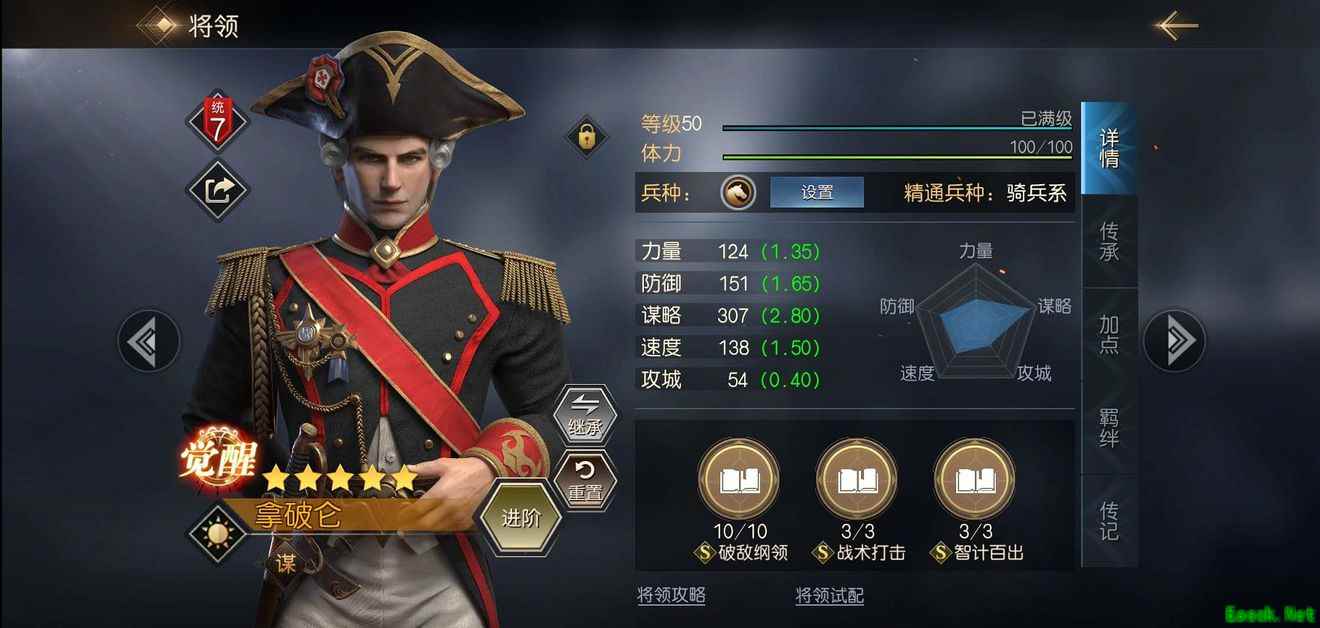 拿破仑自带技能为【破敌纲领】,可以在战斗开始后第1/3/5/7回合,对敌方单体(优先兵力最少)发动1次谋略攻击(初始伤害率150%,满级267%),[附加效果]:若自身兵力大于目标时,额外造成谋略伤害(初始伤害率60%,满级105%)、若击败目标可再次发动造成谋略伤害(初始伤害率150%,满级267%)、身为主将时,额外降低敌人30点速度,持续2回合。