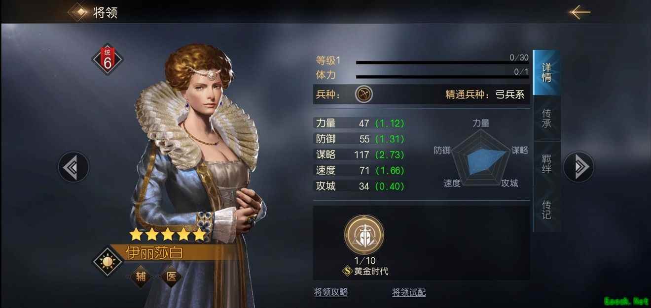 伊丽莎白的自带技能为【黄金时代】,能够在战斗中的3-6回合对己方全体恢复一定兵力(恢复率初始64%,满级100%),并且有一定几率(初始48%,满级75%)使己方单体获得1回合的【满兵伤害】状态(无视当前兵力,造成兵力最大限伤害)。可见,此技能在恢复兵力之余,还有概率使主将的输出能力提升到满兵状态水平。