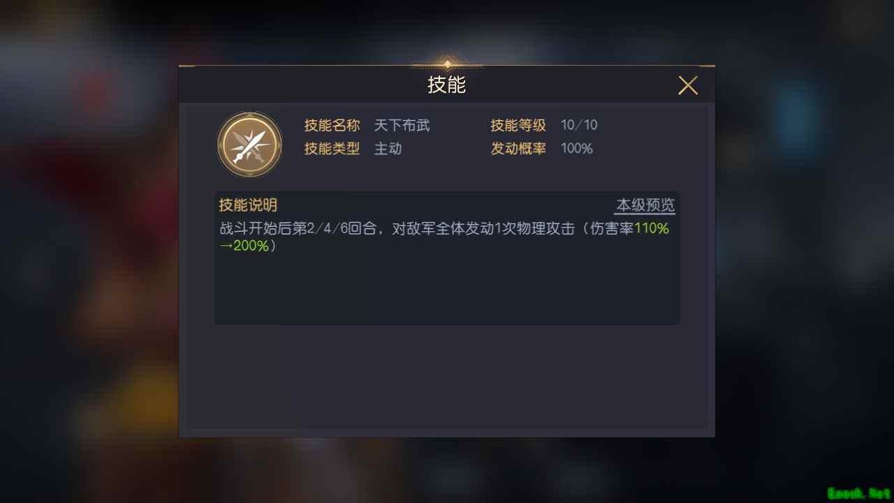 织田信长的自带技能为【天下布武】,为主动技能,有100%的概率在战斗的2/4/6回合对敌军全体发动1次物理攻击(伤害率初始110%,满级200%,受力量属性的影响)。此技能效果简单,为特定回合的AOE输出技能,由于是100%的触发概率,技能整体的输出水平非常可观,加上织田信长本身的力量属性(成长率)就非常高,对此技能的伤害加成也十分明显。