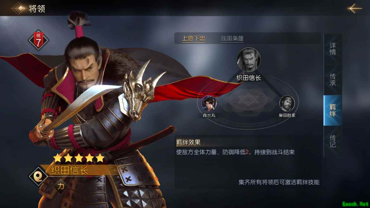 柴田胜家+森兰丸+织田信长,可触发【上恩下忠】,使敌方全体力量、防御降低2。