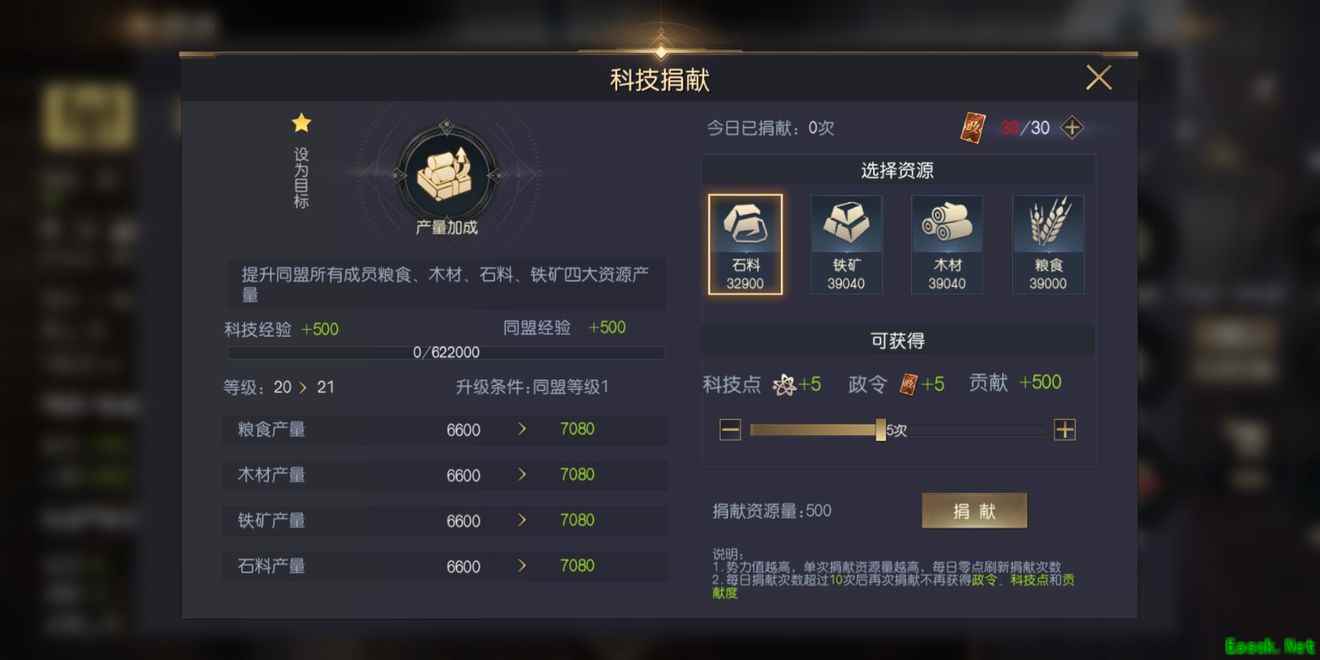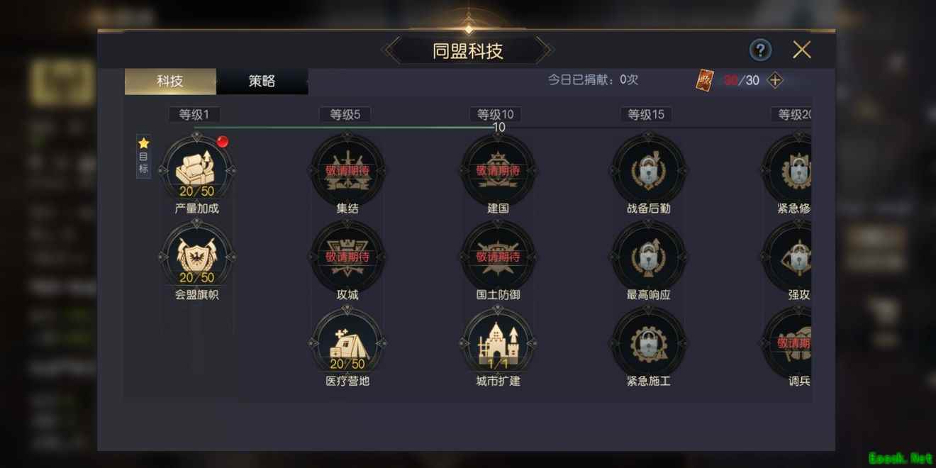 在介绍同盟科技和同盟策略之前,我们需要先来了解一下同盟科技和对应策略的获得途径。通过成员资源捐献的方式提升科技等级。个人势力值不同,每日单次捐献资源量不同,势力值越高单次捐献量越大。每日00:00刷新每日捐献,每日前10次捐献,每次捐献个人政令+1,同盟科技点+1。每日捐献10次后再次捐献将无法获得贡献度、政令、科技点,同时捐献科技及同盟经验获取按原效率1/100转化。