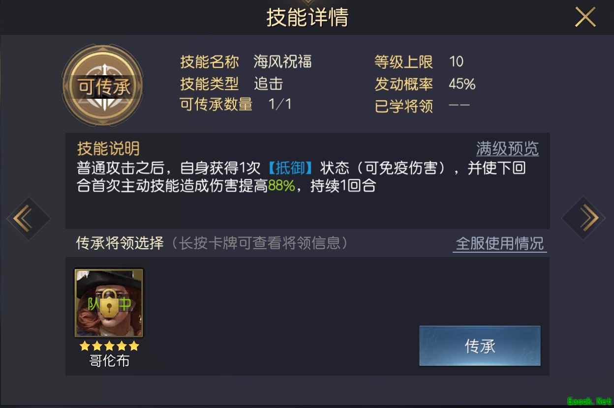 作为一名航海家,哥伦布一生中的多数时间,都是在海上度过的。四次远航,让他见识到了很多以往不曾想象过的奇景,也因此丰富了人类对于大洋生态的认知。比如发现和利用了大西洋低纬度吹东风,较高纬度吹西风的风向变化。证明了大地球形说的正确性。这一发现,也在《征服与霸业》中被设定为哥伦布的传承技能【海风祝福】。技能效果为,普通攻击后,自身获得一次【抵御】(免疫伤害),并且使下回合主动技能伤害提高88%(满级160%)。这是一项攻守兼备的技能,适用范围较广,配合哥伦布本身带有【连击】效果的主动技能【新大陆】,能组合出非常不错的输出表现。