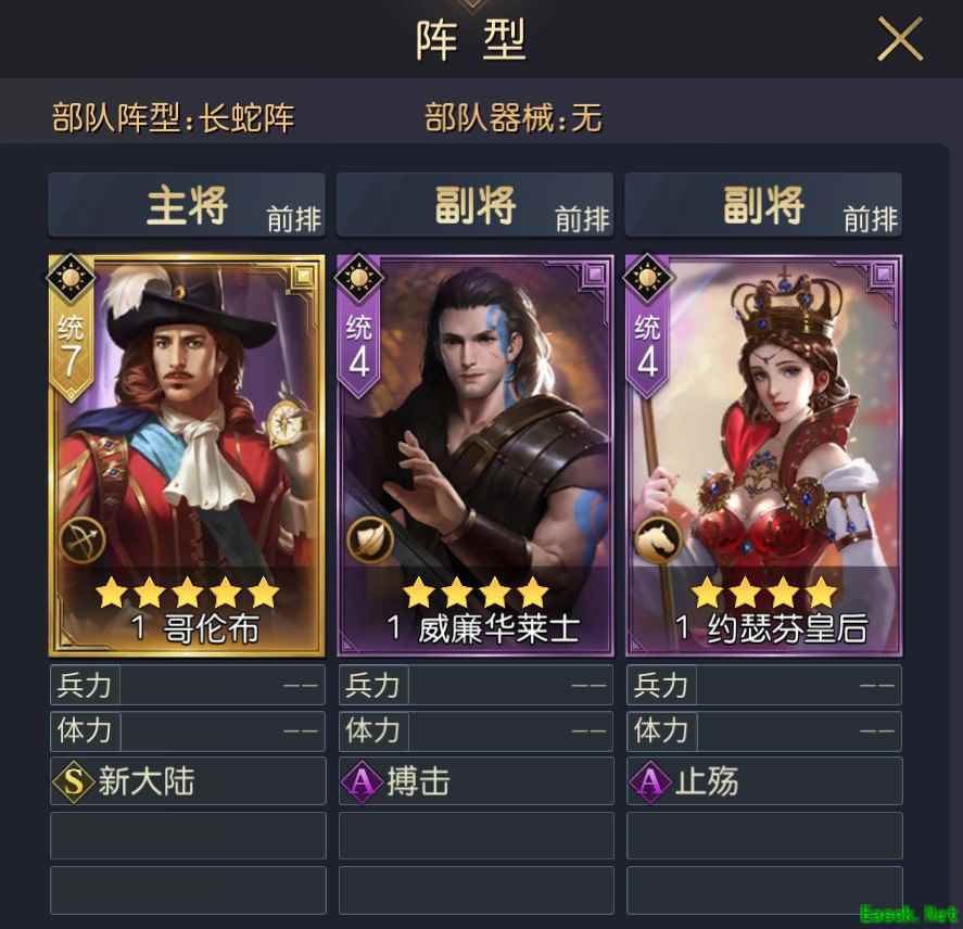 哥伦布在《征服与霸业》中的定位为力量型英雄,主将技能【新大陆】带有强力的【连击】效果,配合传承技能的免伤、增伤效果,能够让哥伦布成为队伍中的输出主力。但与此同时,其自身并没有额外的攻击效果可触发,也没有相应的辅助技能可以保障自身的存活能力,所以在搭配阵容时,必然需要配置一名辅助型将领,来保障队伍的续航能力或是进一步提高队伍输出伤害。在玩家前期将领较为稀缺的情况下,推荐选择“哥伦布+威廉华莱士+约瑟芬皇后”。