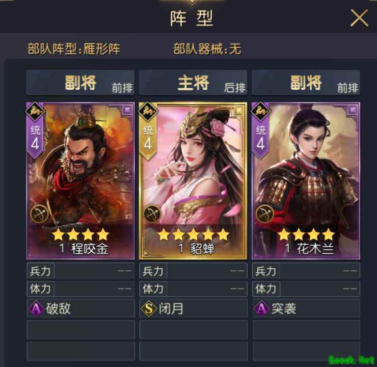 貂蝉作为一名辅助型将领,可以放在后排,携带有治疗效果或强化控制效果的技能。其他将领可以选择两名输出。在玩家前期橙色将领不多的情况下,可以选择“程咬金+花木兰+貂蝉”。程咬金的技能“破敌”可以在进入战斗后前4回合,对敌方造成“流血”状态,让敌方持续受到伤害;花木兰的技能“突袭”,能在敌方拥有“流血”状态的同时,再次造成额外伤害。