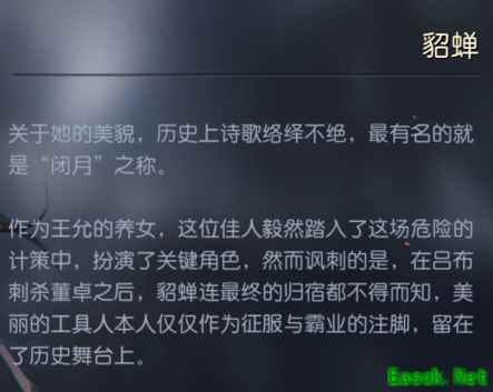 相传,貂蝉在王允的后花园拜月时,忽然有一阵清风吹来,一朵浮云遮蔽住了皎洁的明月。此后,王允逢人就夸自己的义女如何美貌,连月亮都害羞地躲在了云彩后面,貂蝉也就流传出了“闭月”的美名。游戏中,貂蝉的专属技能“闭月”,正是源自这个典故。效果是准备一回合后,优先对敌方一名智力最低的将领发动一次谋略攻击,并使其陷入“混乱”状态,攻击和技能不分敌我。值得一提的是,“闭月”的特殊效果是当敌方将领是吕布时,不分敌我的“混乱”会升级为“蛊惑”,使吕布必定攻击己方目标。