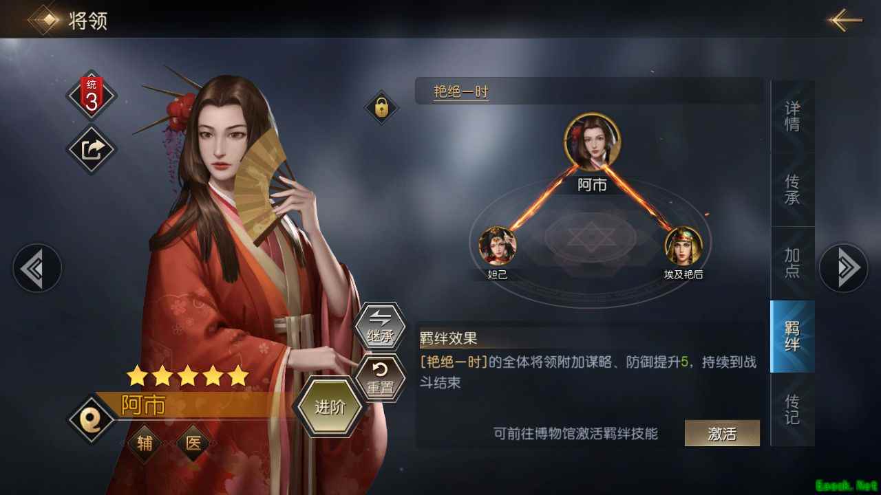 阿市的羁绊为:阿市+妲己+埃及艳后,当用户集齐这三个将领时可激活【艳绝一时】羁绊效果,即使己方全体的谋略、防御属性提升5。这个效果对于此羁绊阵容来说是非常实用的,例如在【阿市+妲己+埃及艳后】情况下,妲己和埃及艳后均为谋略输出型将领,在羁绊效果的加成下能够有更高的扛伤能力和输出能力。