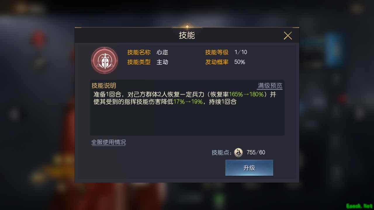 阿市的自带技能为【心迩】,属于主动型技能,能够在战斗中以50%的概率发动,具体效果为:准备1回合,对己方群体两人恢复一定兵力(恢复率初始165%,满级300%),并使其受到指挥技能的伤害降低一定百分比(初始17%,满级35%),持续1回合。从技能我们可以看出,阿市能走的路线只有两条,一是2、3技能带辅助,配合1技能打团队增益,二是2、3技能带恢复,走纯奶妈路线。