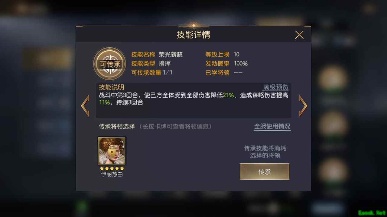 考虑到阿市属于辅助型将领和医师型将领,所以建议在为其搭配二三技能的时候选择辅助型技能,提升阿市的辅助能力,这里推荐【荣光新政】、【浮叶】等。其中,【荣光新政】能够在第3到6回合使己方全体受到的伤害降低一定百分比(初始21%,满级30%)且造成的谋略伤害提高一定百分比(初始11%,满级20%),能够大幅度减少己方队伍受到的伤害,且非常适合于搭配谋略将领的情况;【浮叶】能够在战斗开始的前4回合以50%的概率对己方群体2人恢复兵力(恢复率初始150%,满级240%)并驱散【灼烧】【中毒】状态,且在恢复目标兵力大于80%时,获得1次【抵御】状态,此技能能够大大提升阿市的兵力恢复能力,且能够为队伍带来一定的解控效果。这类技能能够大幅度增强辅助(包括恢复兵力)能力,非常适合于阿市。
