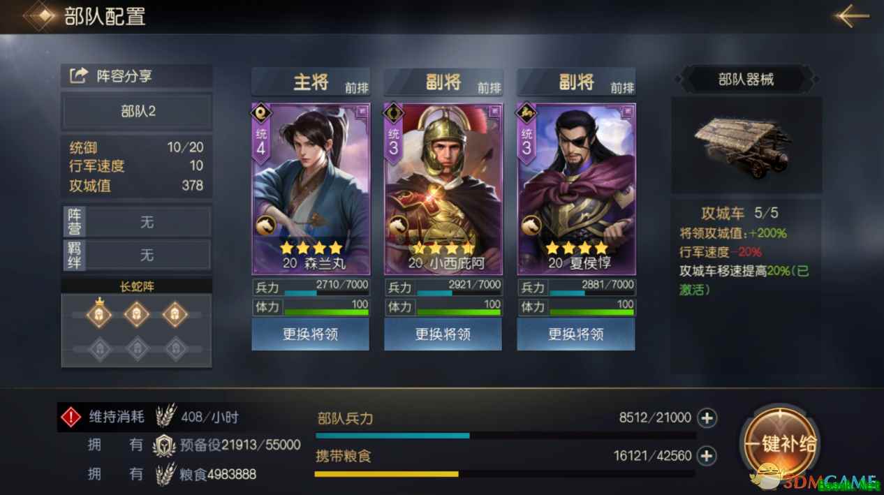 需要注意的是,《征服与霸业》中武将的攻城值是按照星级顺序来的,因此为了保证武将的基础攻城值,在性价比方面由四星的武将来构成拆迁队最佳,同时攻城值也需要一定的等级来支撑,因此拆迁队的武将最好维持在20-30级左右最佳。