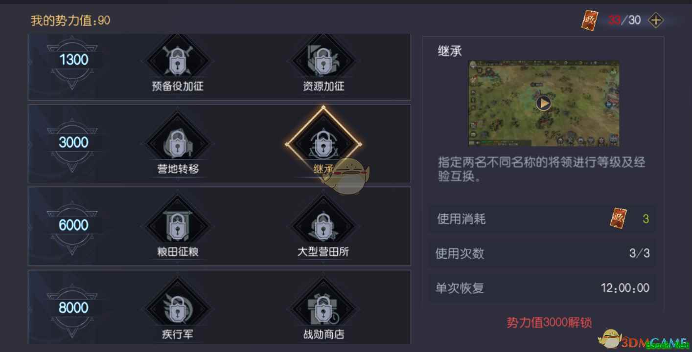 同时每一次“继承”只需花费3个政令即可,十分亲民。