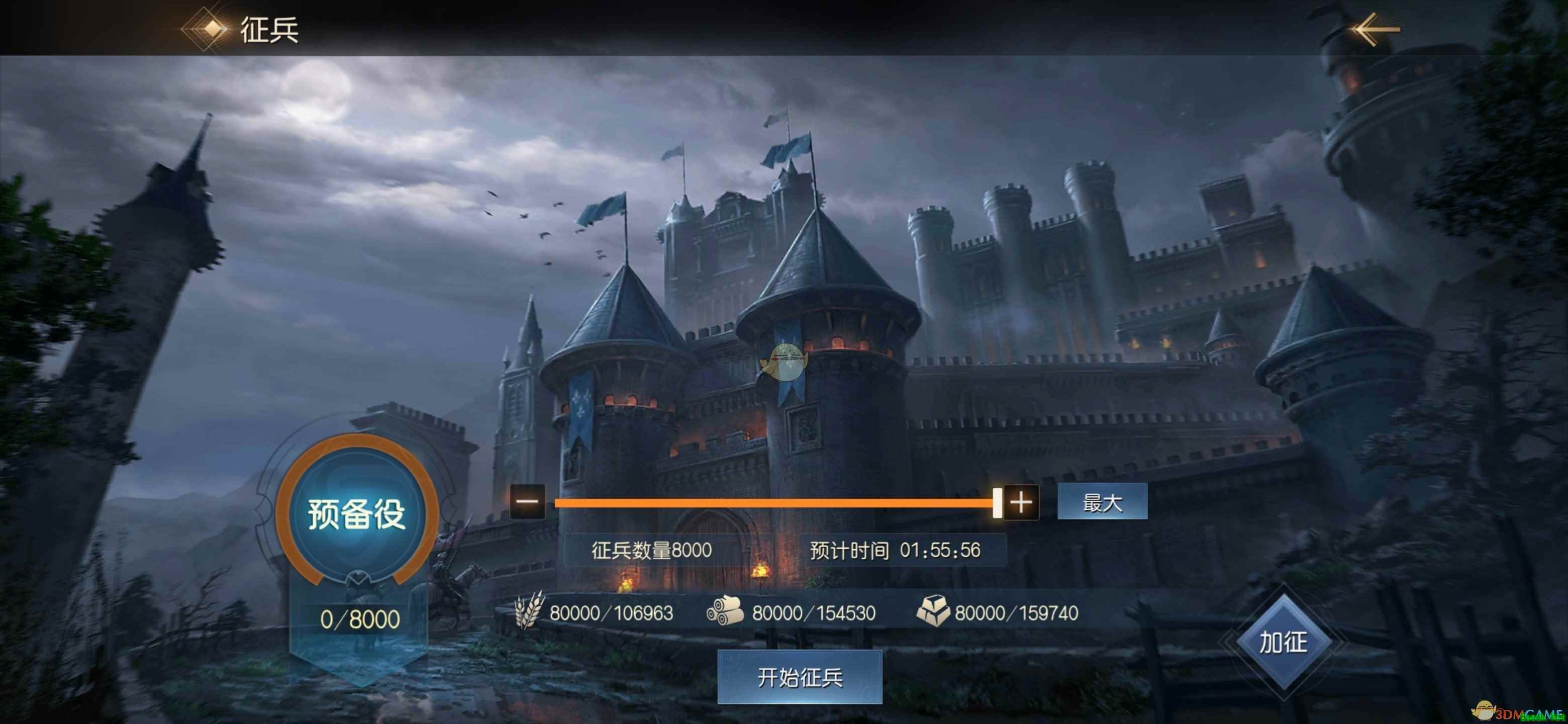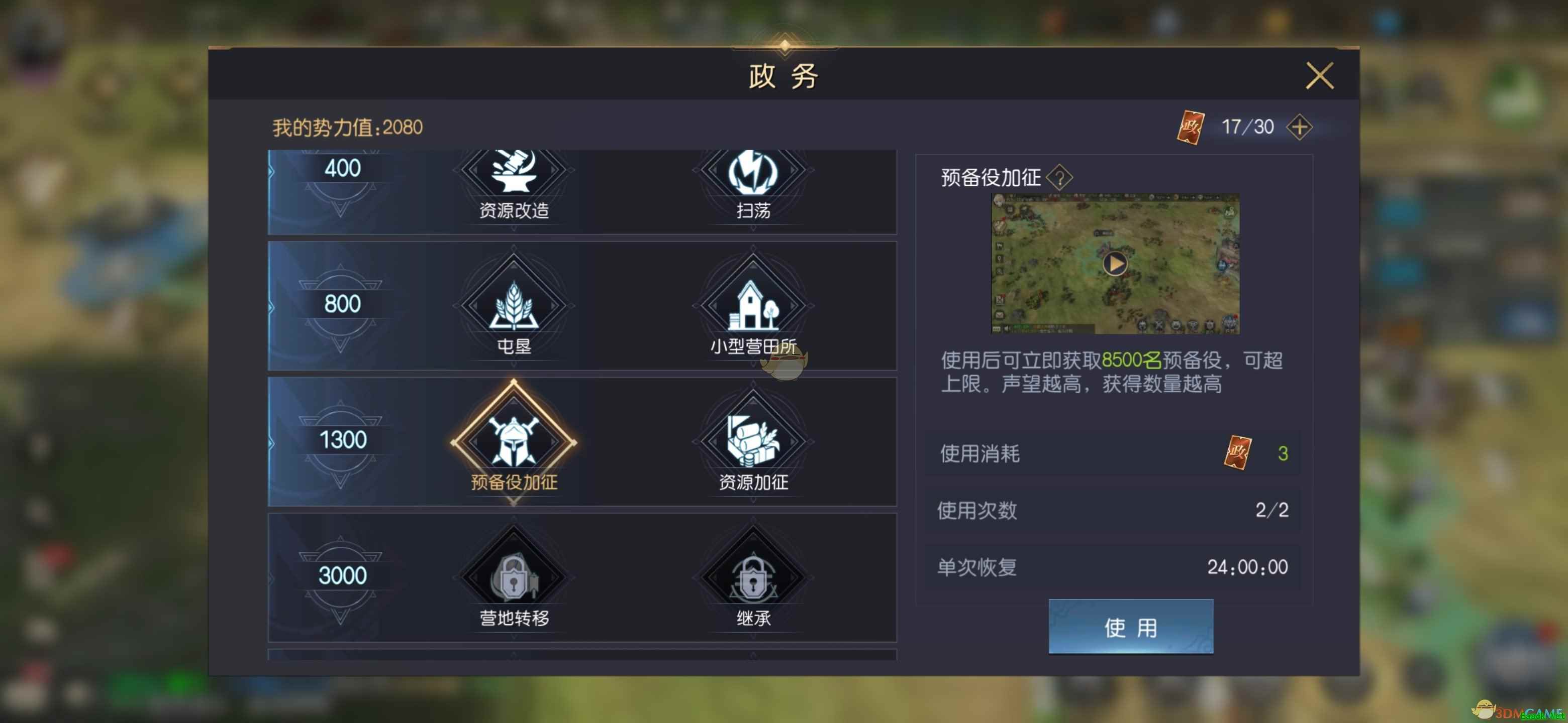 前期,玩家的部队会大量升级,很快就会遇到预备兵不足,无法满编的情况。此时不要花费任何资源进行征兵,而是直接使用预备役加征功能,一次补齐你的部队。按照图里的转换比来算,3点政令就相当于255000点征兵资源,简直血赚。