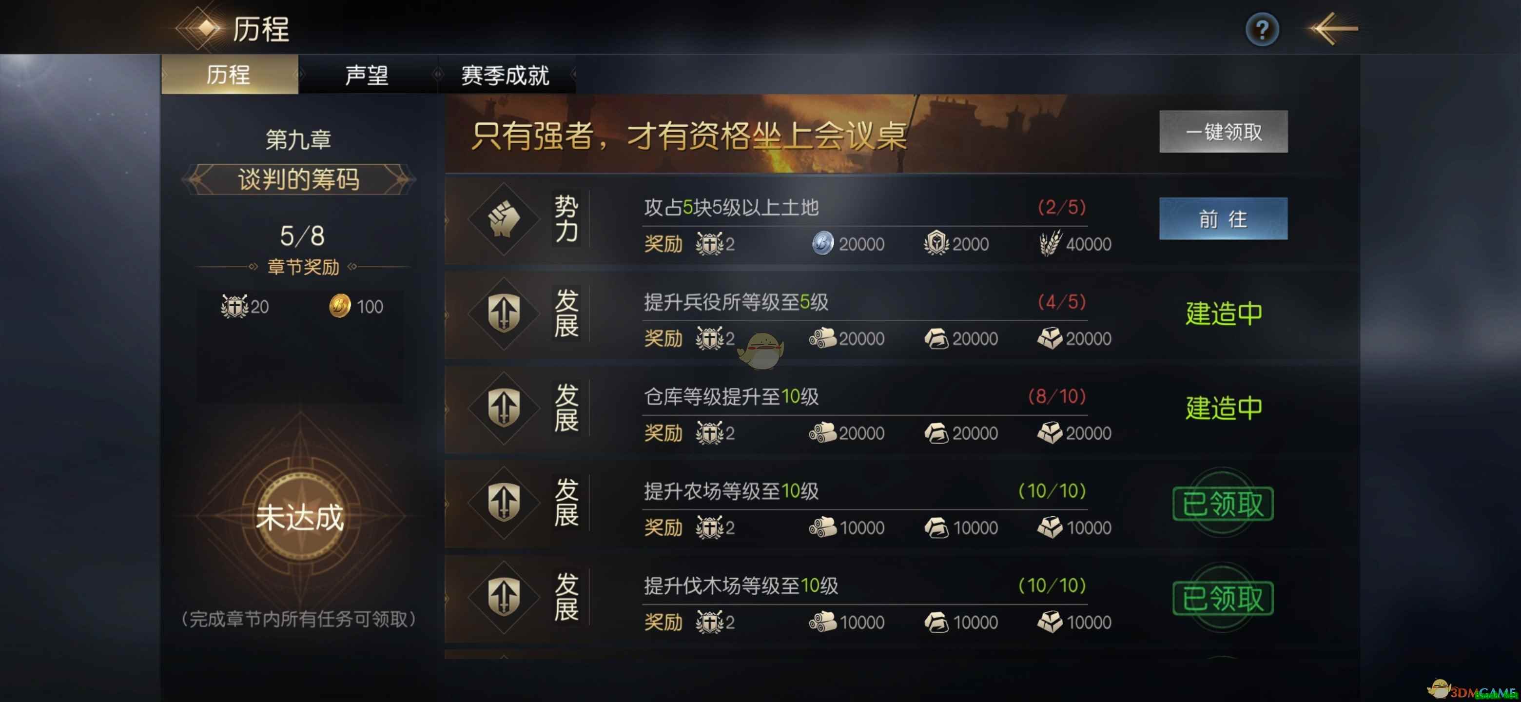 如果按照以上的大方向进行资源分配,那么你在前9个历程章节里完全不会被卡建筑资源,唯一有障碍的就是攻打5块5级地的任务,而打下5级地块的时候,其实你已经过渡到发展平台期了。