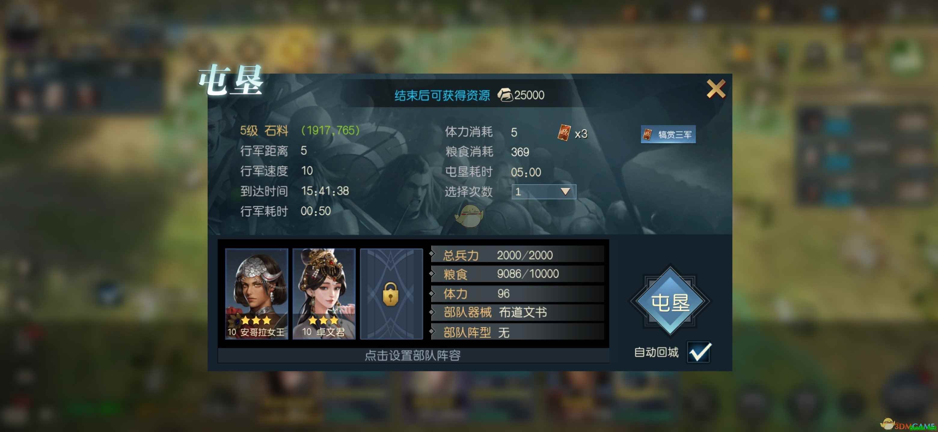 如果石料紧缺,就派出打杂队前往目前最高级的石料地块进行屯耕。5级地块一次屯耕可以换取25000的资源,所以第一个5级地块务必打石料地。