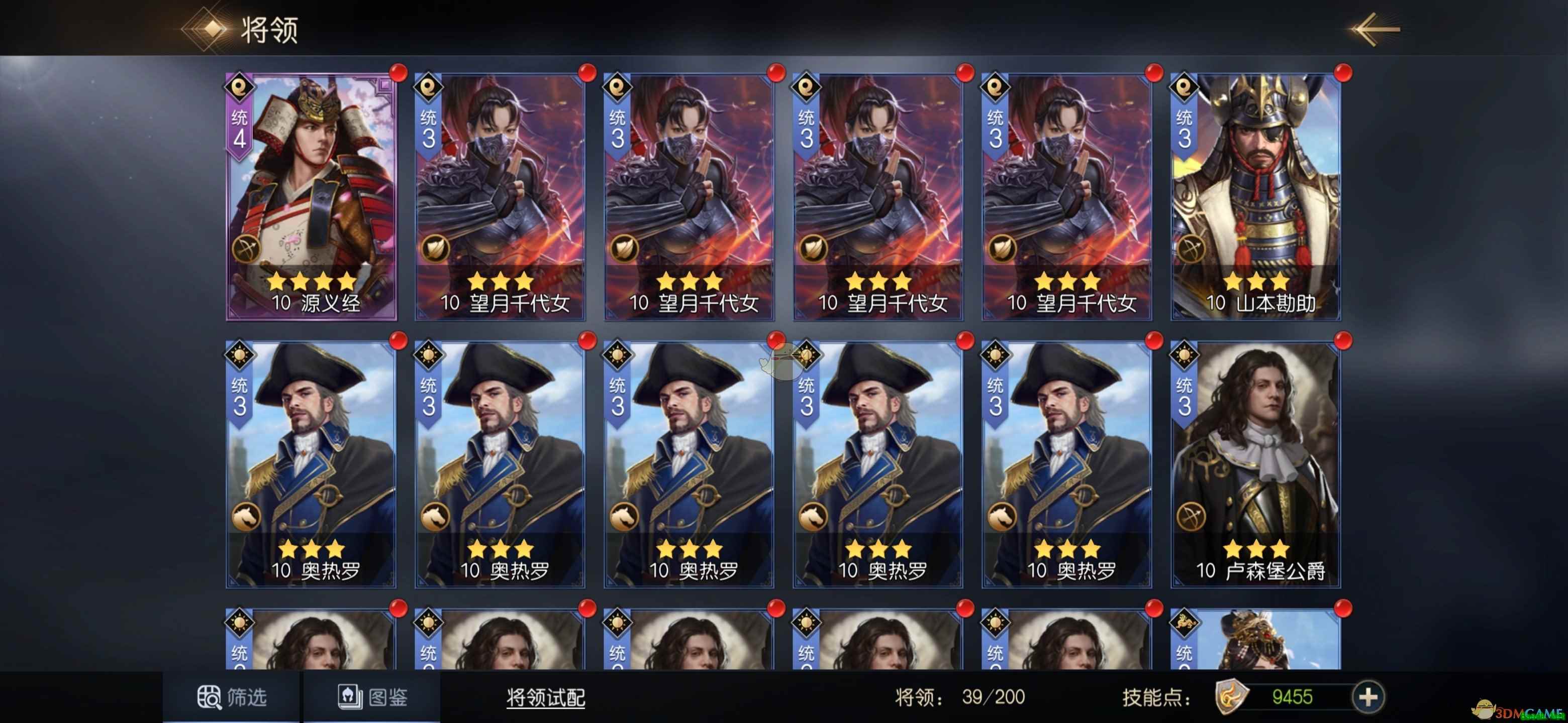换到的技能点尽量把主力队的主将的技能全部升满,4星以上的将领只要满技能战力都不低。但是不要硬升技能等级,至少要存5万左右的银币,用于临时建筑序列和其他用途。