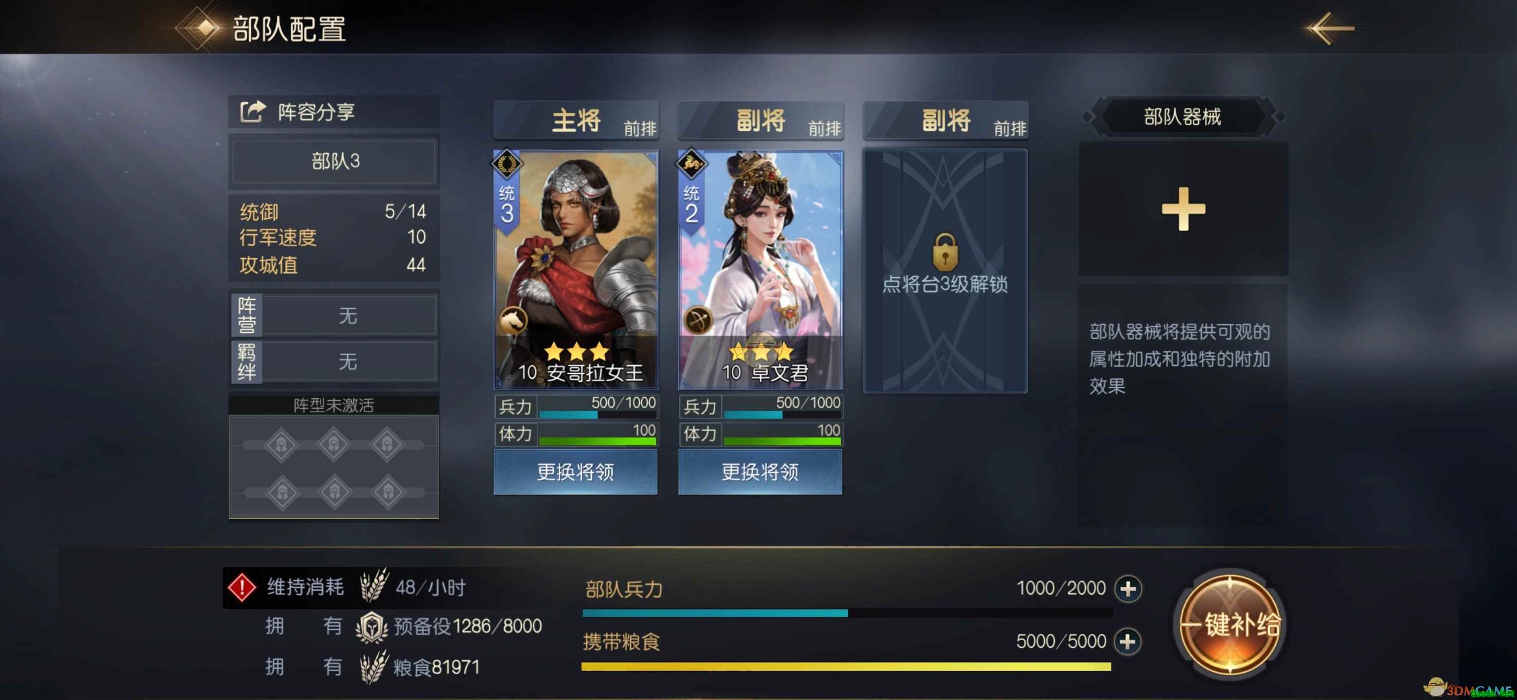 如果你有多余的蓝将,可以再组建一支2人打杂队,部队兵力拉到1000左右,不能占用太多的预备兵资源。这支队伍用来打1、2级的地块,还能负责屯田。
