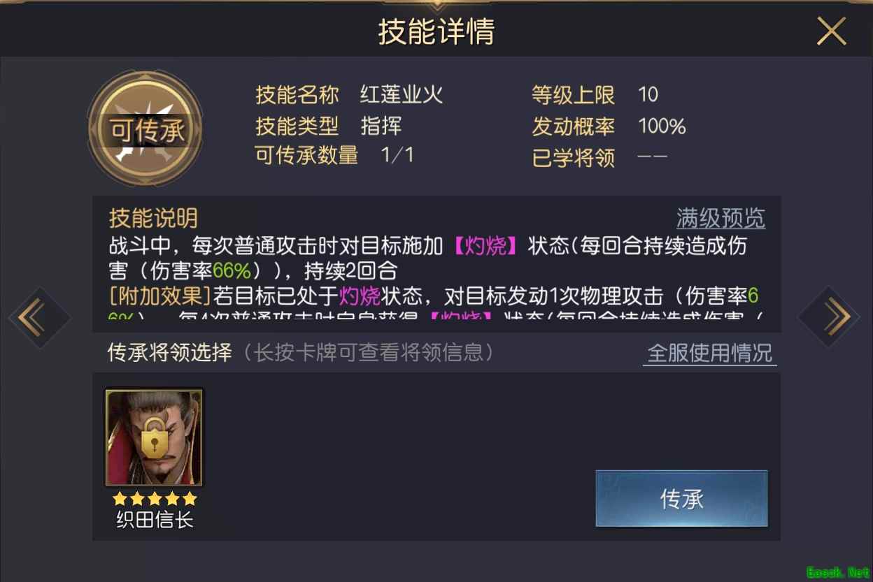 信长的一生,命中犯火。就像中国古代经历过多次兴佛灭佛一样,佛教常常因占用土地、社会劳动力等问题,与封建统治者产生矛盾,日本也不例外,这就有了信长的“火烧比睿山”事件。信长的归宿同样是火,本能寺之变中,信长于熊熊烈火中消失。“红莲业火”语出佛教,比喻烧尽罪恶之火。技能效果为,每次普通攻击对目标附加【灼烧】状态,持续2回合。如果敌人已经有此状态,那么对其发动1此物理攻击。需要注意的是,每4次普通攻击,自身也将获得【灼烧】状态,持续1回合。
