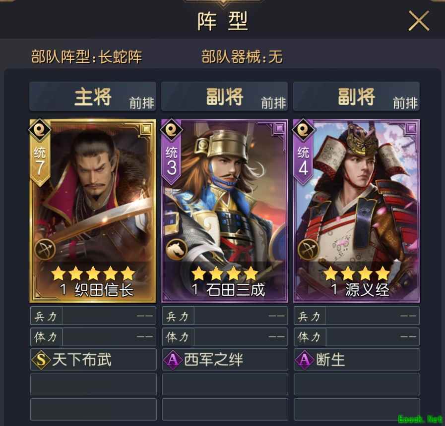 游戏后期,玩家橙色将领齐全的情况下,推荐队伍为“织田信长+酒井忠次+佐佐木小次郎”。