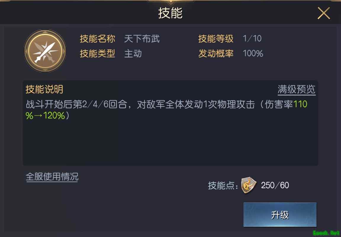 阿提拉的专属技能“上帝之鞭”,可以使自己与己方主将获得【群攻】状态,普通攻击时有50%几率攻击敌方群体,技能本身更偏辅助性质,优点是同时作用于2人。“天下布武”虽然隔1回合才能发动1次,但几率100%,伤害倍率极高,胜在稳定。