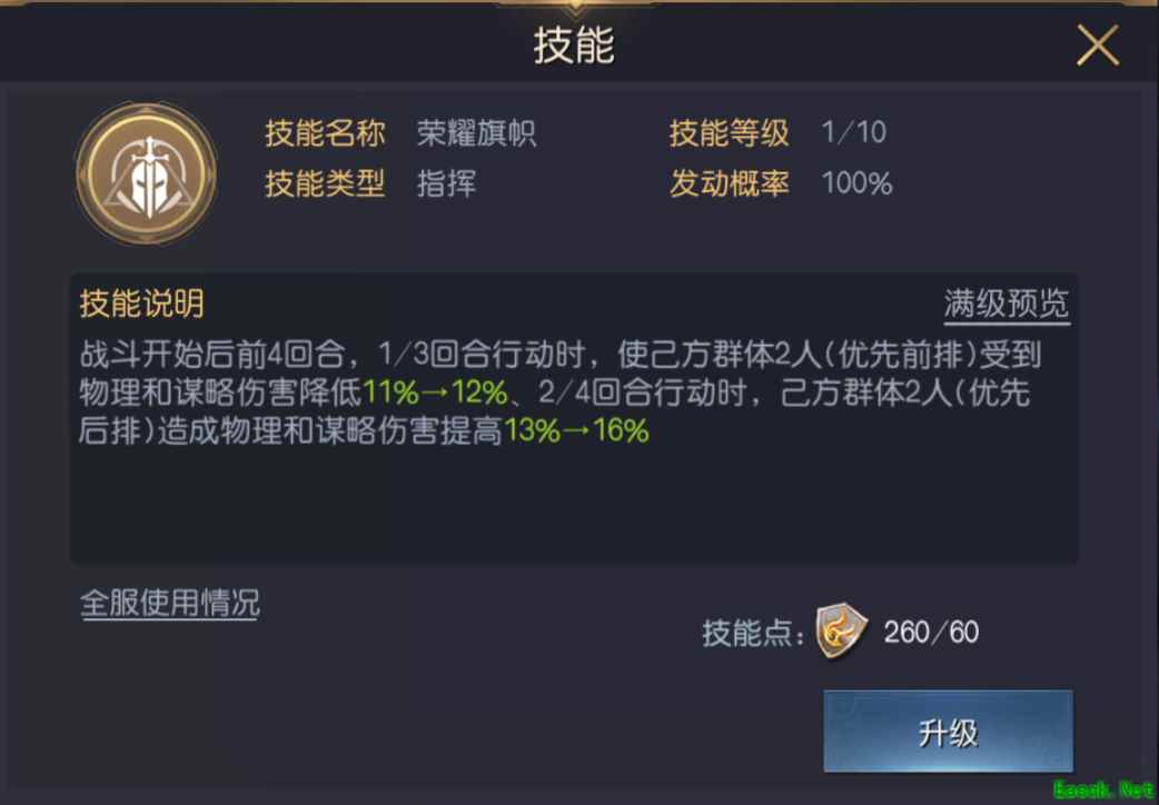 贞德作为一名辅助型武将,可以在前期时就快速登场作战,而且不需要花费太多的资源去培养。其专属技能“荣耀旗帜”是一个非常全面的辅助性质技能,不仅能够提升前排武将的坦度,还能提升后排武将的输出。这就使贞德在前期开荒打地的过程中,能显著降低队伍的战损,或者越级打等级较高的地块。