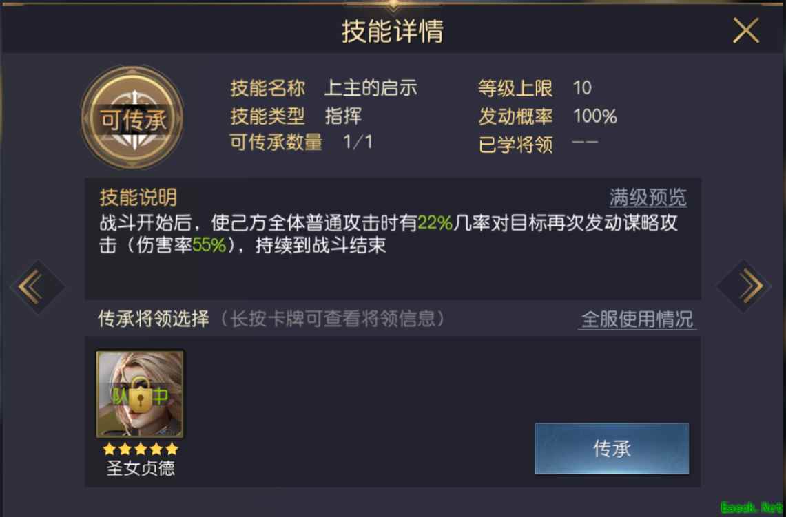 “上主的启示”,是贞德会成为天主教圣人,以及被后世称为“圣女贞德”的原因。正是由于圣女的身份,贞德统帅的法军,一直认为自己是在主的指示下战斗,正义在法军,因而很快扭转颓势,接连获得对英作战的胜利。不幸的是,贞德在被俘获后,被英国打上了“异端”和“女巫”的标签,十九岁便因火刑而牺牲。在游戏中,“上主的启示”成为了贞德的传承技能。效果为使己方全体在普通攻击后,有概率再次发动谋略攻击。