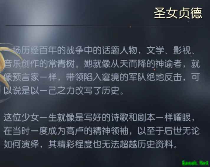 作为天主教的圣人之一,圣女贞德并非如同传统天主教徒那般,以身着长白衣或祭服的形象出现在文学、美术或是影视作品当中,而是一身戎装。这是因为贞德在英法百年战争期间,在法国最危急的时刻,亲自披挂上阵,率领法军反攻英军,并且多次获得了胜利。当时很多人都不敢相信,一个16岁的未成年小姑娘,竟然有着如此强大的影响力。《征服与霸业》中的贞德形象,亦是一名身着铠甲的少女。游戏中,贞德被定义为辅助型武将,是因为贞德在英法百年战争期间,以受到“上主的启示”为由,鼓舞了颓废的法军斗志,以“神启”之名,对英军发起反攻,收复了大片法国失地。