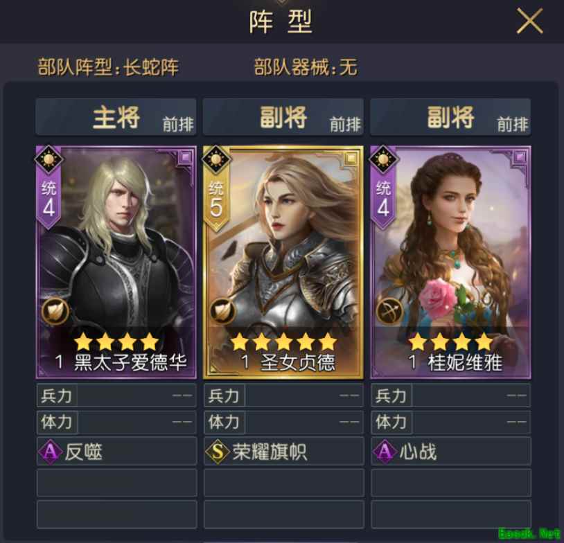 在前期阵容搭配上,推荐贞德放前排,再携带有治疗效果的技能。其他两名武将可以选择二输出或者一输出,一前排。在玩家前期橙色武将不多的情况下,可以选择“黑太子爱德华+贞德+桂妮维雅”。黑太子爱德华的技能“反噬”,在进入战斗后,可以直接获得力量和防御属性加成,并且在受到控制效果后,还有一定几率反制施法者,对其造成同样的控制效果,是前期非常优秀的前排武将;桂妮维雅的技能“心战”,可以同时造成一次物理伤害和谋略伤害,能最大化地利用“荣耀旗帜”同时增加物理和谋略伤害的效果。而且三名武将同属西洋阵容,在玩家建造“西洋崛起”建筑后,三名武将在战斗时,还能获得全属性10%的加成效果。