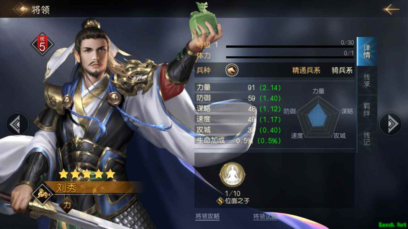 刘秀作为一个力量型输出将领,他的力量属性比较高,五维属性除了防御和速度略高之外,其技能不仅能造成不错的基础伤害,还可对带【负面】状态的敌人再次造成额外伤害,非常适合在buff队中担任输出。
