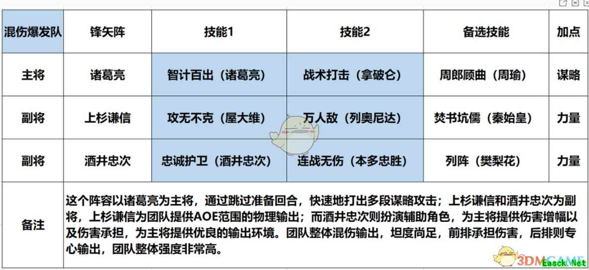 这个阵容以诸葛亮为主将,通过跳过准备回合,快速地打出多段谋略攻击;上杉谦信和酒井忠次为副将,上杉谦信为团队提供AOE范围的物理输出;而酒井忠次则扮演辅助角色,为主将提供伤害增幅以及伤害承担,为主将提供优良的输出环境。