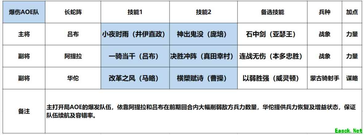 在阵容搭配时,推荐【吕布+阿提拉+华佗】。这个阵容以吕布为主将,阿提拉和华佗为副将。阿提拉自带技能【上帝之鞭】,使得主将吕布每回合必获得【群攻】状态;华佗为其提供兵力恢复,阵容的主要伤害就是以吕布的AOE伤害为主,首回合2波高伤害的AOE狂轰滥炸,后续稳定AOE伤害收割残局,战斗胜利变得非常简单。