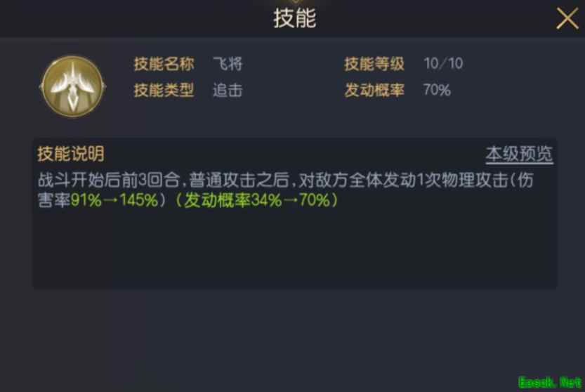 飞将是一个发动几率34%的追击型技能(满级之后发动几率提升至70%),技能效果为:战斗开始后的前3回合,普通攻击之后,对敌方全体发动1次物理攻击(伤害率为91%,满级为145%)。