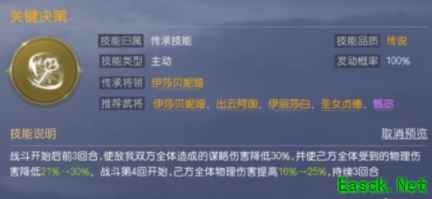 这是一个发动几率为55%的主动型技能,技能效果为:驱散敌方单体全部增益状态,并使其受到的物理伤害提升16%(满级提升25%),持续2回合。
