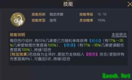 效果分析:【魏武挥鞭】这个技能有两个效果,其附加效果使得曹操更适合担任主将位置,利用【易伤】增加敌方受到的伤害。曹操每回合都有较大几率附加我方将领【会心】和【奇谋】状态,使其造成的伤害翻倍提升,输出能力瞬间提升一个档次。